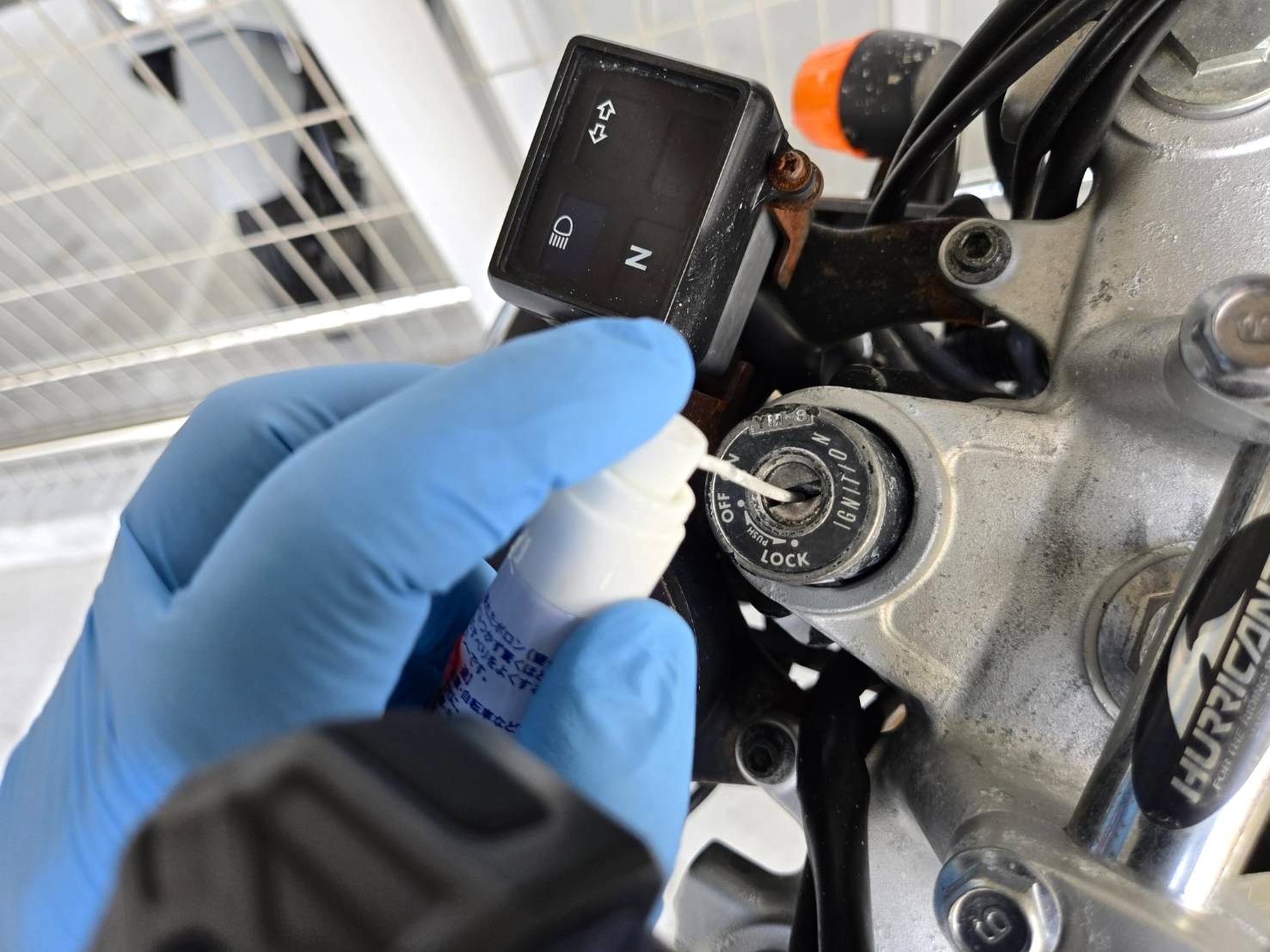 鍵穴にパーツクリーナーを吹き付け、エアダスターで内部のゴミや水分を吹き飛ばしてみると鍵は回るようになり、ハンドルロックを解除することができました。